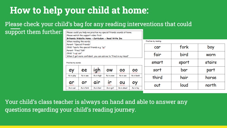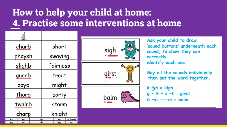 Your child will be receiving lots of support at school from their class teacher in order to prepare them for the phonics screening check. Your child's class teacher may provide you with additional resources to complete at home to prepare them for the check.